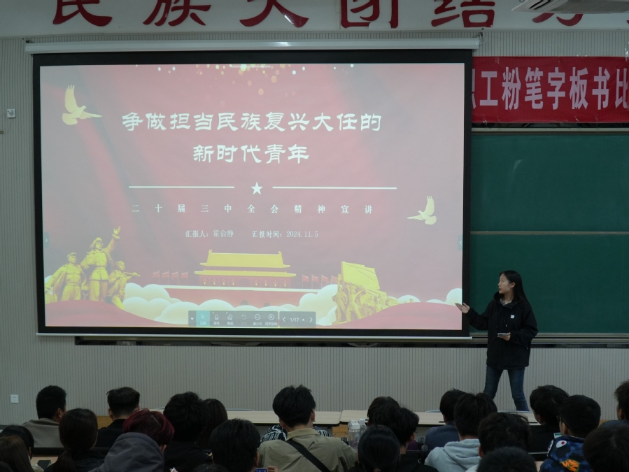 为深入学习宣传贯彻党的二十届三中全会精神,促进同学们对形势与政策的关注,11月5日,丝路书院大学生宣讲团成员霍俞静面向24级各班班长、团支书和治保委员开展了党的二十届三中全会精神主题宣讲活动,书院分团委书记张晓远出席本次活动。