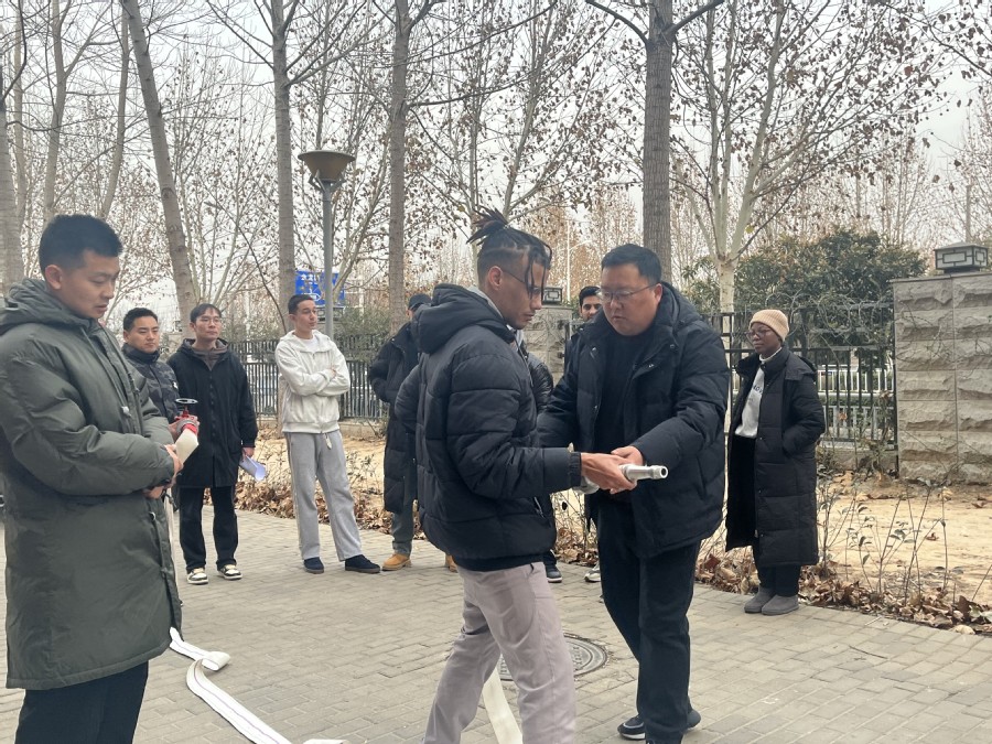 疏散演练结束后,学校保卫处王龙老师为留学生讲解了火灾的危害性及预防措施、示范了灭火器、消防水带的正确使用方法,并组织留学生们现场操作,熟悉基本的消防技能。通过面对面的学习、手把手的实践,留学生们的消防安全意识、遇险自救的能力得到提升。