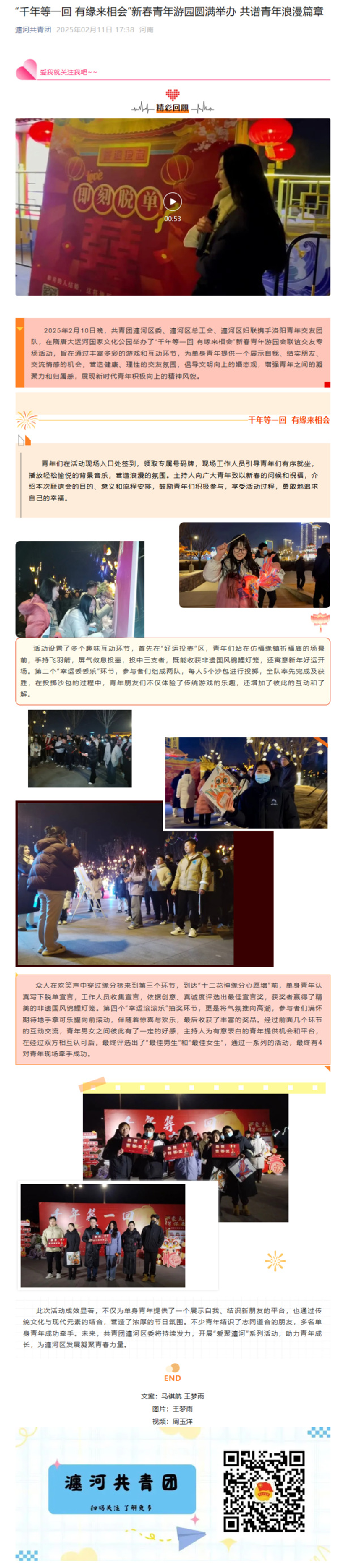 李璐瑶在这个寒假期间参与了区团委组织的“向基层报到”的活动。在洛阳市共青团瀍河区委、瀍河区总工会、瀍河区妇联携手洛阳青年交友团队,在隋唐大运河国家文化公园举办的“千年等一回有缘来相会”新春青年游园会联谊交友专场活动中担任志愿者,帮助进行活动场地搭建,活动过程推进以及摄影方面的工作,参与区团委助力青年成长,为瀍河区发展凝聚青春力量的工作,为家乡的发展出一份力,也为自己收获了宝贵的经历与成长。