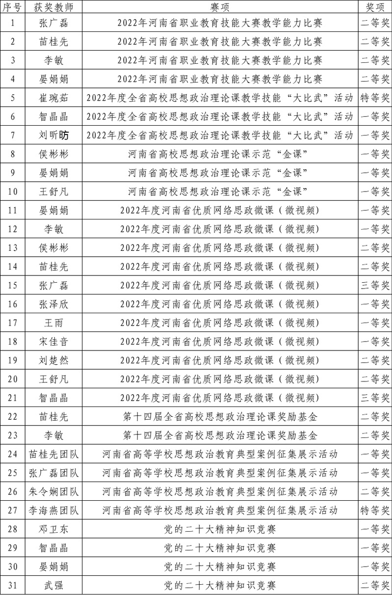 此次表彰活动共为四组教师共七个赛项进行颁奖,分别为2022年河南省职业教育技能大赛教学能力比赛、2022年度全省高校思想政治理论课教学技能“大比武”活动、河南省高校思想政治理论课示范“金课”、2022年度河南省优质网络思政微课(微视频)、第十四届全省高校思想政治理论课奖励基金、河南省高等学校“同心喜迎二十大 师德筑梦育新人”教师思想政治教育典型案例征集展示活动以及“自信自强立大志 踔厉奋发向未来” 党的二十大精神知识竞赛,共有二十余位教师上台接受表彰,具体获奖名单如下表。