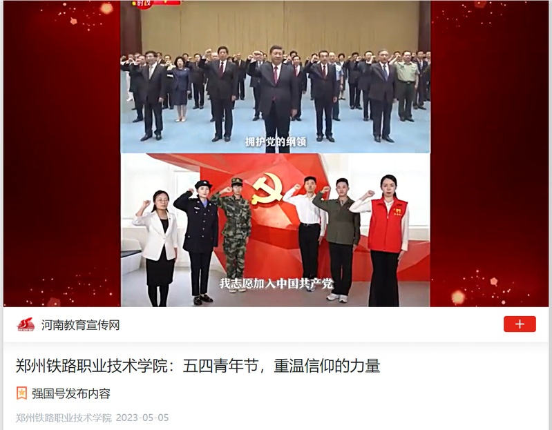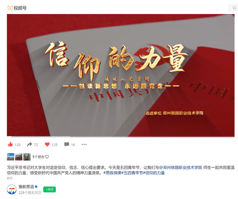 为积极响应河南省教科文卫体工会和校工会组织的“悦读新思想 永远跟党走”经典诵读活动,由马克思主义学院党总支书记胡宪刚指导,刘楚然、赵月菡、尹航、张岩、赵山、张人镜等专兼职思政课教师参与出演的经典诵读视频——《信仰的力量》被学习强国和豫教思语等官媒转发报道。