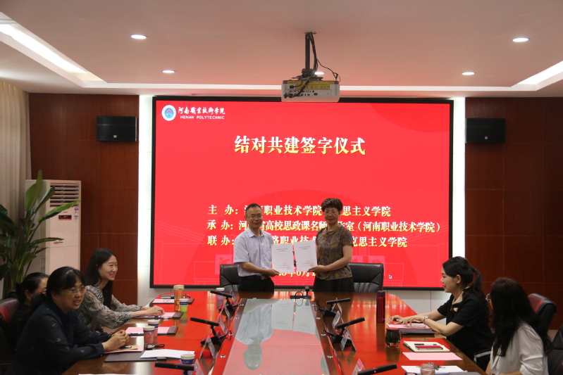 仪式上,梁杰院长代表学院对我院的到来表示热烈欢迎。随后,梁杰院长和胡宪刚书记分别围绕各校马克思主义学院基本情况、建设情况、建设成效、特色创新等方面作了深度交流。胡宪刚书记表示,与河南职业技术学院马克思主义学院结对共建是加强我校马克思主义学院内涵式发展、深化马克思主义理论研究和教学的重要举措,希望两校马克思主义学院深化内涵共建,依托双方思政课名师工作室相互促进、协同发展。