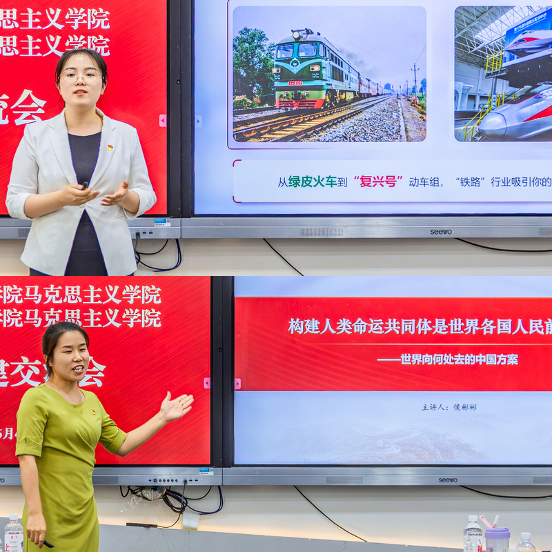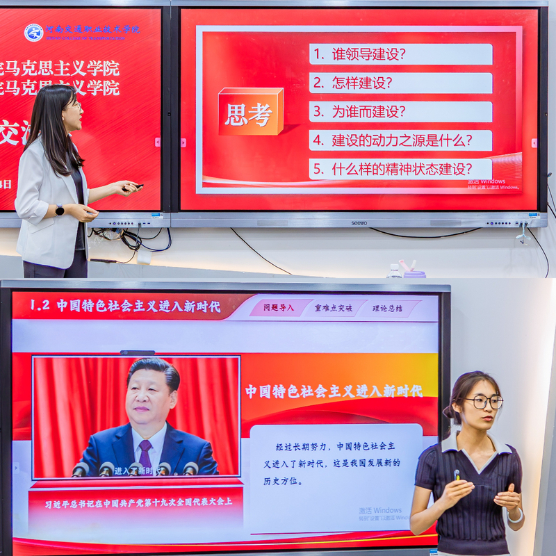 在教学展示环节,河南交通职业技术学院教师卢毅鸣、李文博与我校教师王雨、侯彬彬分别围绕《习近平新时代中国特色社会主义思想概论》课程相关章节依次进行了8-10分钟的教学展示。四位教师以扎实的理论功底、创新的教学设计、生动的教学语言,展现了各具特色的教学风采,现场研讨氛围热烈,教学创新思路不断涌现。