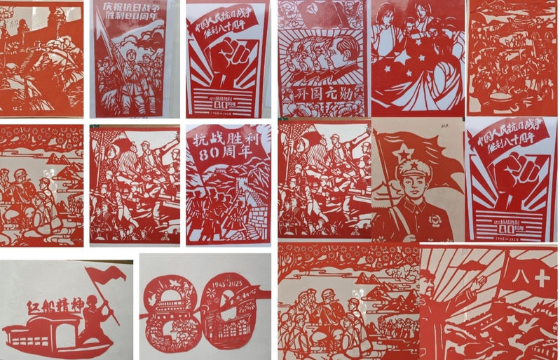 参赛作品以匠心传承红色精神,既有《开国元勋》再现领袖风范、《抗战胜利80周年》定格烽火岁月,也有《中国梦》以山河为卷、信仰为笔的艺术呈现。有人以刚劲线条刻画八路军战士冲锋的英姿,刀锋游走间似闻战场呐喊;有人以细腻纹路勾勒百姓为前线送粮的场景,尽显军民鱼水深情。参赛选手李同学为还原“织红旗”细节,查阅史料反复修改刀法,坦言“每一剪都像穿越时空与历史对话”。这些作品不仅是技艺的展现,更成为连接历史与青春的桥梁,让红色记忆在指尖艺术中“活”了过来。