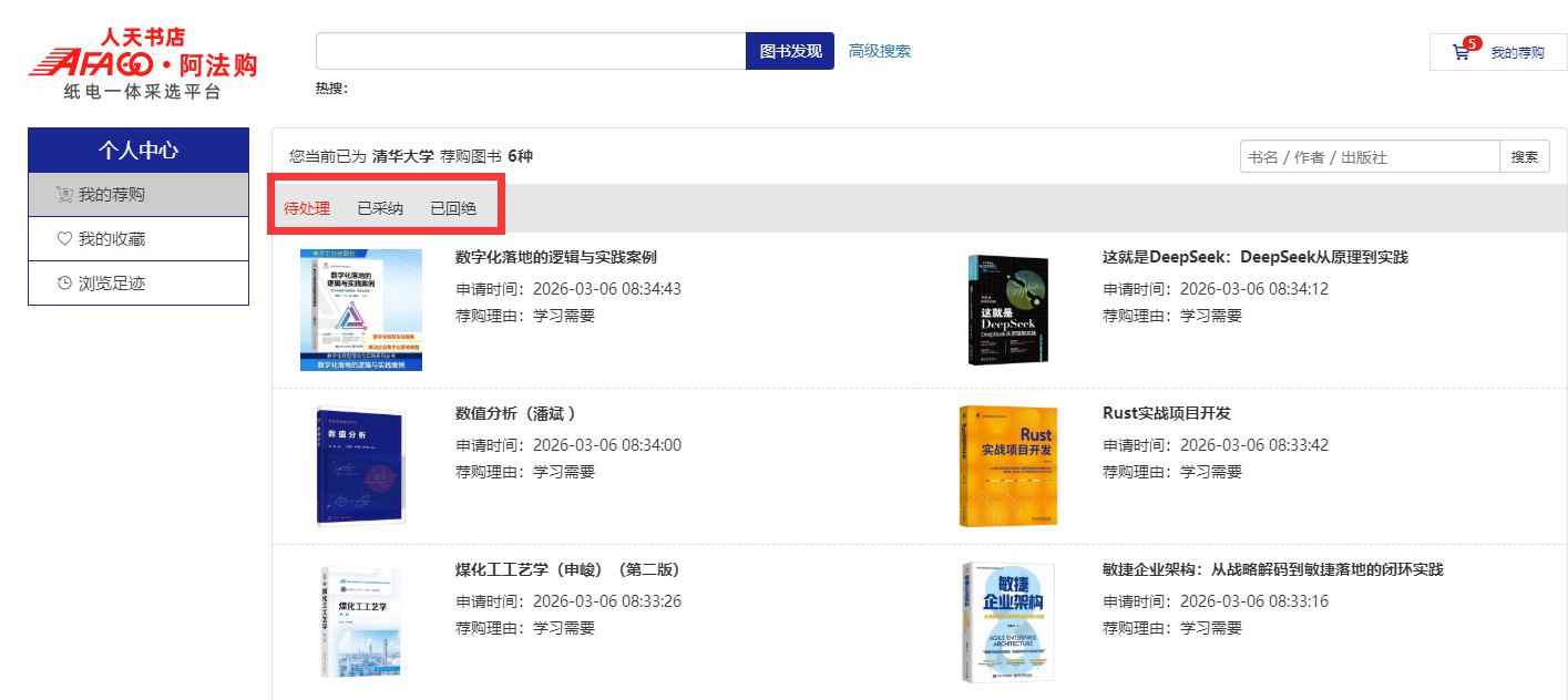 3、我的荐购:【个人中心】→【我的荐购】中可查看到所有的荐购书目,及图书馆的采纳情况。