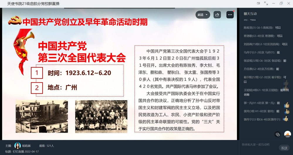 2022年4月17日晚,天使书院启航分党校第二期培训班第四讲以线上直播的方式开展。本次授课由天使书院育人导师杨皓越主讲,授课内容是党的发展历程。