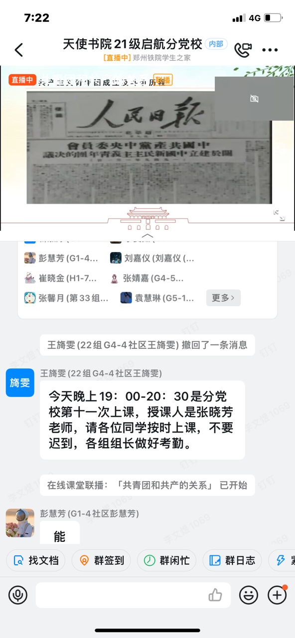 2022年4月23日晚,天使书院“一站式”学生社区启航分党校第二期培训班第十一讲以线上钉钉直播的方式开展,本次授课教师是天使书院育人导师张晓芳。