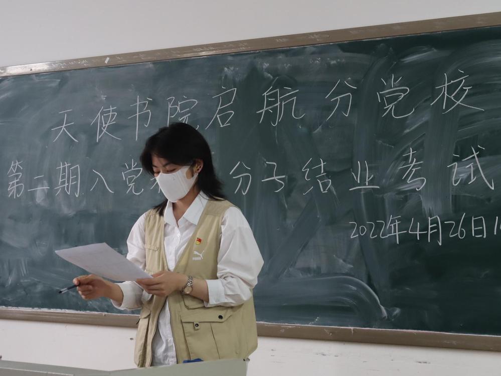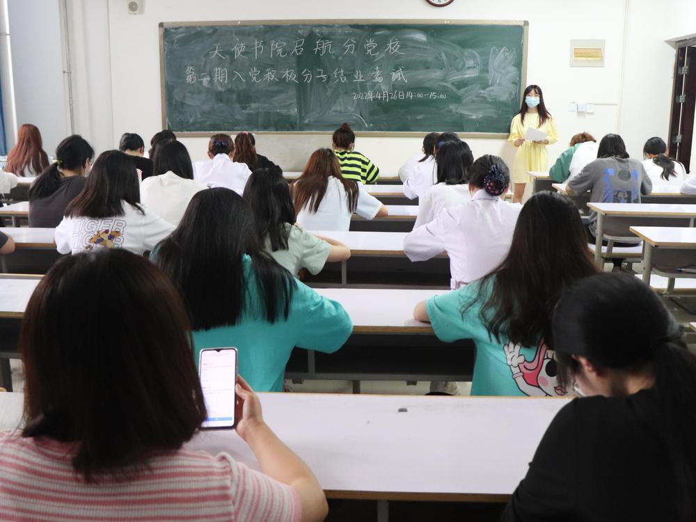 2022年4月26日下午,天使书院启航分党校第二期培训班结业考试在7号楼12个教室采取线下闭卷形式举行。天使书院全体党员教师担任本次结业考试监考官。