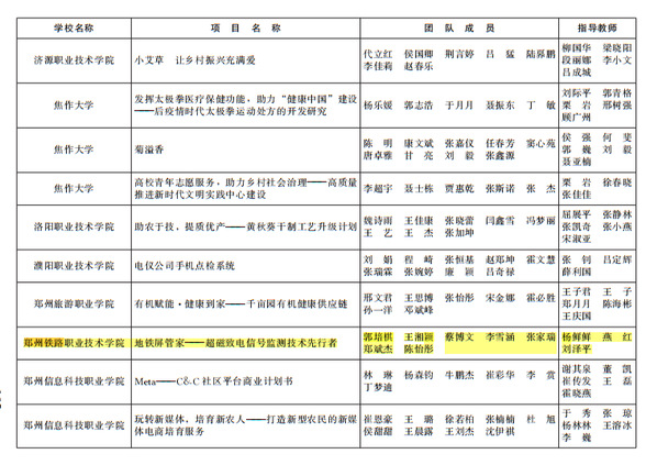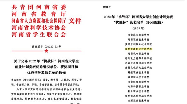 近日,由共青团河南省委、河南省教育厅、河南省人力资源和社会保障厅、河南省科学技术协会、河南省学生联合会共同举办的2022年“挑战杯”河南省大学生创业计划竞赛落下帷幕。我校在比赛中表现优异,获得代表大赛集体成绩的“优胜杯”荣誉称号,我校学子作品在省赛中斩获特等奖1项、金奖1项、银奖5项和铜奖16项,《高铁电管家——基于荧光测温探针的温控技术先行者》作品成功推荐“挑战杯”国赛,8位教师荣获“优秀指导教师”称号。