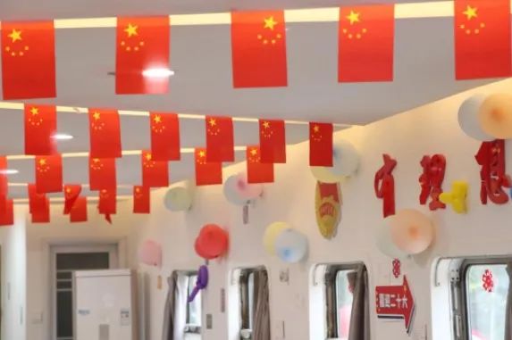 走进书吧内部,映入眼帘的是一面面飘扬的五星红旗、一张张铁院学子制作的国庆剪纸和具有铁路特色的窗花,还有同学们亲手布置的气球、书签等装饰,整个列车书吧被烘托出浓烈的节日气氛。