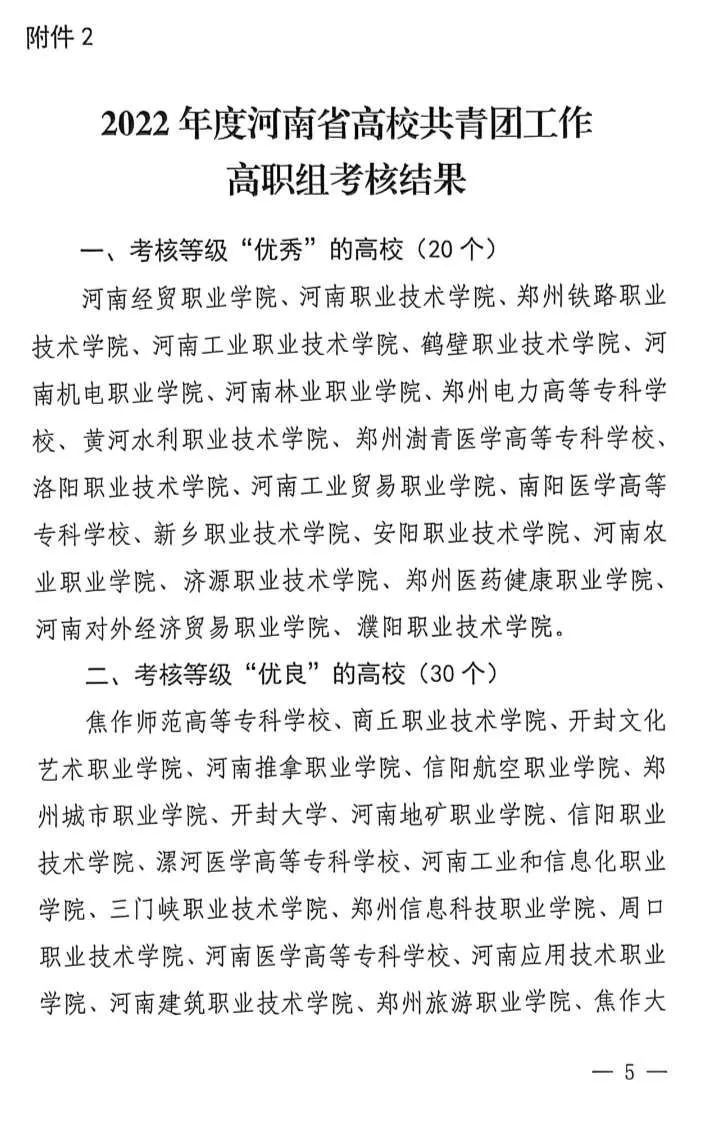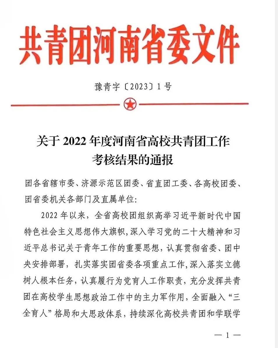 近日,共青团河南省委印发《关于2022年度河南省高校共青团工作考核结果的通报》,公布了2022年度河南省高校共青团工作考核结果,我校团委在全省高校共青团工作考核中连续三年获评“优秀”等级,考核成绩名列前茅。