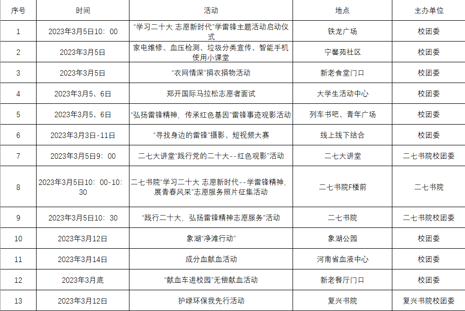 2023年3月5日是毛泽东同志“向雷锋同志学习”题词60周年纪念日,也是第24个中国青年志愿者服务日。为深入学习宣传贯彻党的二十大精神、习近平总书记关于青年工作的重要思想和关于志愿服务的重要指示精神,广泛动员各书院团组织、广大团员青年进一步弘扬雷锋精神及“奉献、友爱、互助、进步”的志愿精神,鼓励和引导全校广大青年积极投身志愿服务事业,校团委决定,以“3·5学雷锋活动日”为契机,号召和动员全校团员、青年志愿者们深入开展形式多样的“学习二十大·志愿新时代”学雷锋志愿服务系列活动。现将活动安排通知如下:
