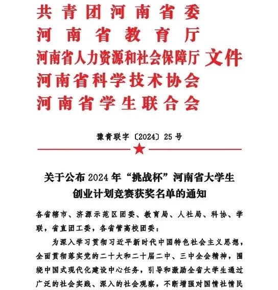 近日,由共青团河南省委、河南省教育厅、河南省人力资源和社会保障厅、河南省科学技术协会、河南省学生联合会共同举办的2024年“挑战杯”河南省大学生创业计划竞赛获奖名单公布。我校在比赛中表现优异,申报的项目中31个获奖,斩获金奖8项、银奖11项和铜奖12项,获得代表大赛集体成绩的“优胜杯”荣誉称号,2个作品成功推荐国赛,31位教师荣获“优秀指导教师”称号,获奖质量和数量均创我校该赛事历史新高。