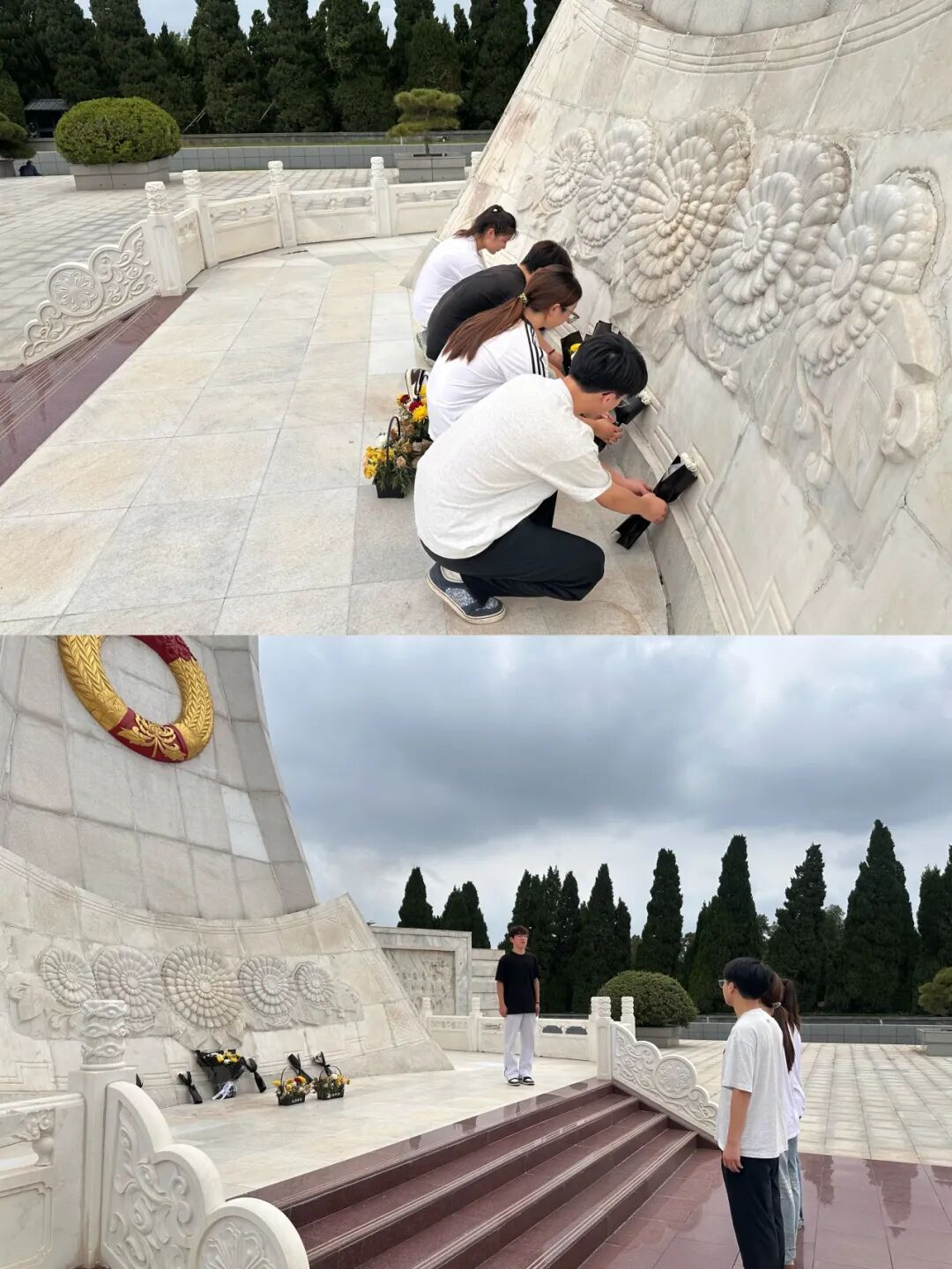 次日清晨,团队肃立于开封烈士陵园,手持白菊祭奠革命先烈。在庄严肃穆的纪念碑前,师生齐唱国歌、重温入团誓词,并开展“红色故事微宣讲”,以《永不褪色的红旗》为题讲述豫东革命史。