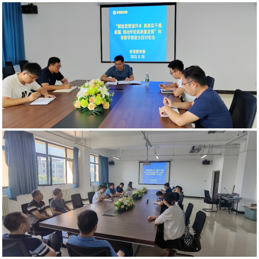 袅袅凉风起,离离暑云散,新学期伊始,体育教学部积极落实学校工作安排,围绕“解放思想谋升本 真抓实干谱新篇 推动学校高质量发展”主题开展大讨论活动,部室主任以及全体教师分别于8月28、29日在部办会议室进行了大讨论,会议均由部门主任王珍主持。