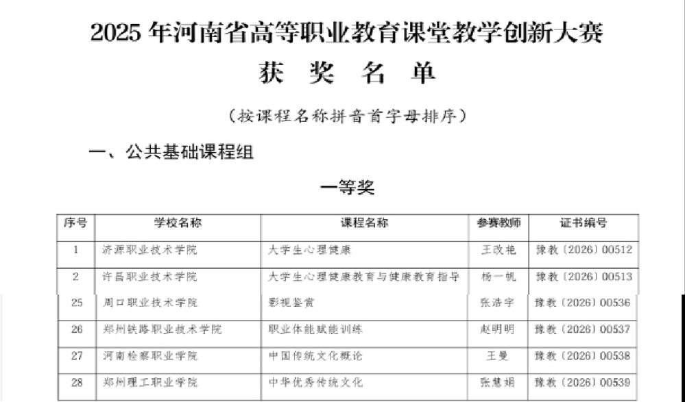 近日,河南省教育厅办公室发布《关于2025年河南省高等职业教育课堂教学创新大赛获奖名单的通知》(教办职成〔2026〕19号),经过省级网络初评、现场决赛等多轮激烈角逐,我部赵明明教师表现突出,获得省一等奖。