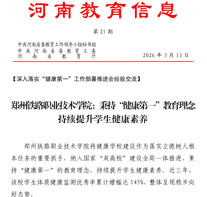 近日,《河南教育信息》(第21期)专刊刊发我校深入落实“健康第一”工作成果文章《秉持“健康第一”教育理念 持续提升学生健康素养》,对学校坚持“以体育人”、构建“教学+竞赛+帮扶”三维联动发展新体系的实践成效给予充分肯定,标志着学校体育育人模式再获省级教育主管部门认可。