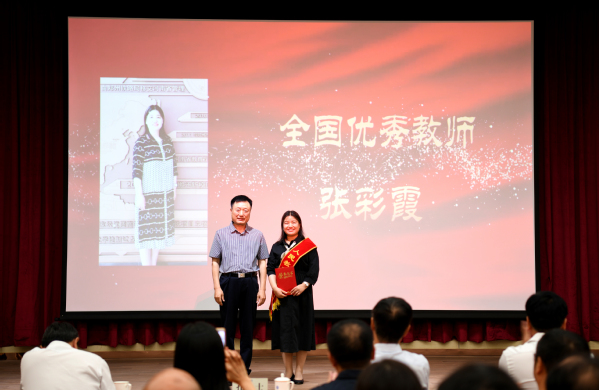 “人间有大爱,杏坛写春秋。三尺讲台,她用爱心丈量三十年;一根教鞭,她用奉献诠释近两万节课的彩……”校长孔凡士宣读了校党委给予全国优秀教师张彩霞教授的颁奖词并颁奖。