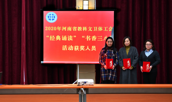 会上,工会相关负责人分别宣读了河南省教科文卫体工会关于“学习习近平新时代中国特色社会主义思想”经典诵读活动、“书香三八”读书活动的获奖情况及我校2020年度“三八”红旗手表彰决定。许琰、谢乾分别为受表彰的女教职工颁奖。