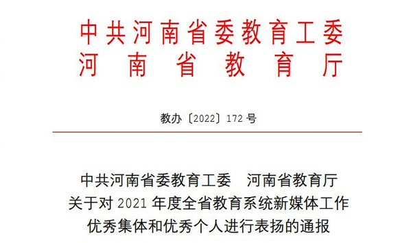 近日,中共河南省委教育工委、河南省教育厅印发《关于对2021年度全省教育系统新媒体工作优秀集体和优秀个人进行表扬的通报》(教办〔2022〕172 号),我校荣获2021年度全省教育系统新媒体工作优秀集体。学校政务微信、政务微博、政务抖音包揽全省高职高专三项第一,综合考核居全省高职院校首位。学校新媒体工作主题策划典型做法荣获2021年度河南省教育政务新媒体优秀案例,党委宣传部赵建成、张岩同志荣获全省教育系统新媒体工作优秀个人。
