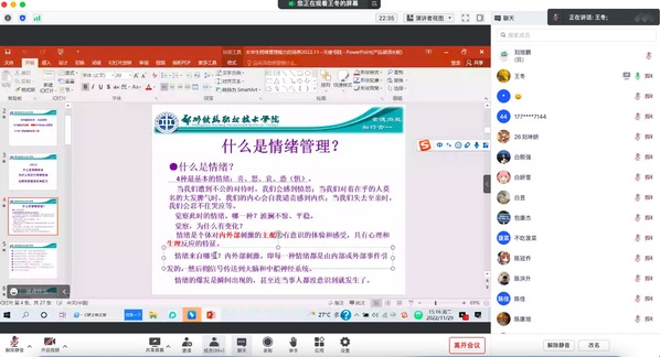 通过线上方式,王冬教授以《大学生情绪管理能力的培养》为题,围绕“什么是情绪管理”“为什么要进行情绪管理”“怎样培养情绪管理能力”三个方面为广大师生带来了一场精彩生动的讲座。结合具体案例和定向训练,王冬教授将情绪管理的专业知识与实用技巧深入浅出地娓娓道来,着重讲解了如何通过“觉察、提升、持续”六字法培养情绪管理能力,并通过线上互动将学生学习成效引向纵深。