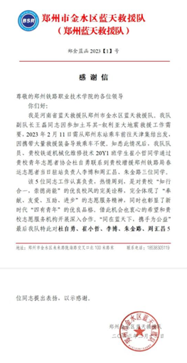 近日,郑州市金水区蓝天救援队向我校发来感谢信,信中对我校杜自勇、崔小哲、李博、朱金路、周汇昌5名同学提出表扬,赞扬他们以实际行动帮助救援队乘客顺利乘车,书写了新时代志愿服务精神,彰显了新时代“四有青年”的优良品格。