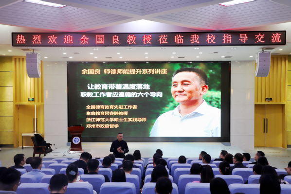 3月6日下午,全国德育教育先进工作者、生命教育网客聘教授、浙江师范大学硕士研究生导师、郑州市政府督学余国良教授莅临我校,以“让教育带着温度落地职教工作者应遵循的六个导向”为题为全校学工人员带来了一场生动活泼、幽默风趣的互动讲座。报告会在第二报告厅举行,全校学工人员一起聆听了此次讲座。