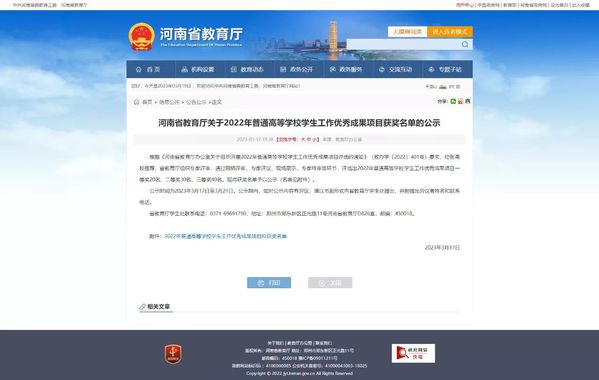 近日,河南省教育厅下发了《关于2022年普通高等学校学生工作优秀成果项目获奖名单的公示》,根据《河南省教育厅办公室关于组织开展2022年普通高等学校学生工作优秀成果项目评选的通知》要求,经高校推荐、省教育厅组织专家评审,通过网络评审、专家评议、现场展示、专家终审等环节,评选出2022年普通高等学校学生工作优秀成果项目一等奖20名、二等奖30名、三等奖40名。我校实践服务育人《“行走的课堂”——中原铁路红色基因青春寻访》项目荣获一等奖,成长导向教育《“红色音符”唱响“新时代华章”,天使书院构建“音乐+”育人新模式》项目荣获三等奖。