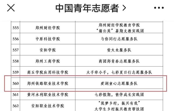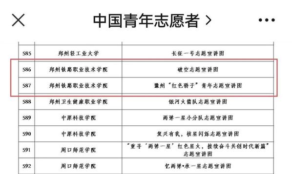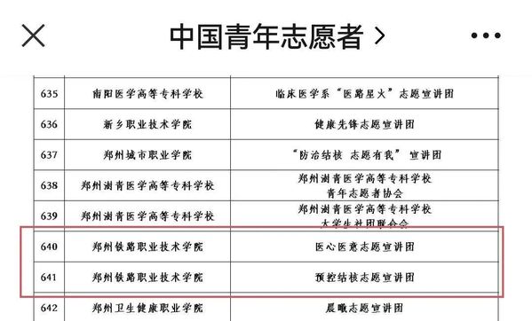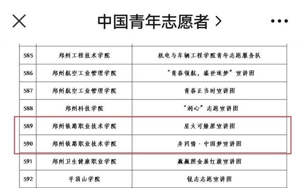 我校团委组织的“星火可燎原”宣讲团、天使书院组织的“井冈情 中国梦”宣讲团入选全国大学生井冈山精神志愿宣讲团;我校团委组织的“医心医意”宣讲团、陇海书院组织的预控结核志愿宣讲团入选全国大学生“防治结核 志愿有我”志愿宣讲团;我校团委组织的破空志愿宣讲团、天使书院组织的豫州“红色骄子”青年志愿宣讲团入选全国大学生“两弹一星”精神志愿宣讲团;二七书院组织的“爱润童心”志愿服务队入选“七彩假期”志愿服务示范团队。