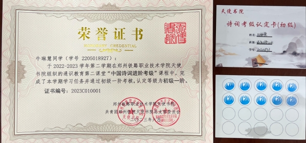 本学期,天使书院立足学生专业培养目标和成长成才需求,从中华优秀传统文化中深挖育人元素,发挥时代价值,以中国古典诗词和毛泽东诗词为切入点,积极组建由书院全体教师参与的通识教育育人队伍,多次组织专题会议开展教学教法研讨,指导“书院建设发展研究中心”自主编制通识教育校本教材《中国诗词考级手册》一套六辑,设置初、中、高三个等级、六个阶段,并通过每周定时更新推送诗词内容、组织考核认定以及开展传统文化类系列学生活动,引导学生积极参与课程学习和第二课堂活动,共计34名学生完成本学期课程学习与考核,获得由书院自主编码的“中国诗词进阶考级·初级一阶”认定证书。