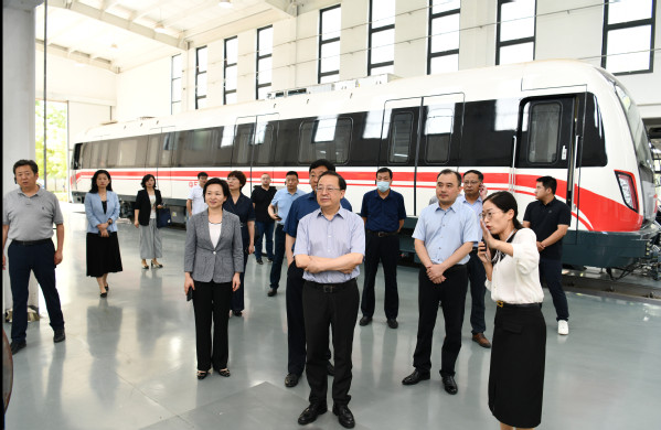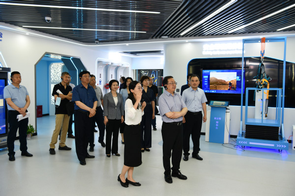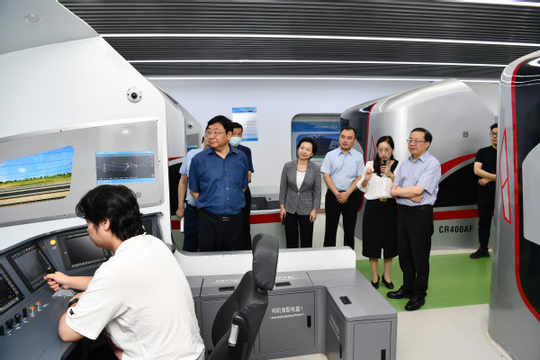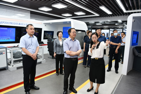 谢玉安一行来到我校轨道交通综合实训基地,查看了复兴号动车组、三层作业平台实训服务设施,观摩了高铁驾驶等实景训练作业情况。在世界技能大赛基地,谢玉安实地观看了转向架、整车检修等模拟测试场景。在铁路安全警示基地,谢玉安分别前往铁路安全、文化等警示教育区,通过VR、人工智能等技术现场了解了铁路安全警示教育内容。随后,谢玉安一行来到高速列车驾驶技术技能研发训练中心等实训室,详细了解了学校“双高”建设、人才培养、产教融合、实习实训、技术研发、经费保障及服务国家和全省重大战略等情况。