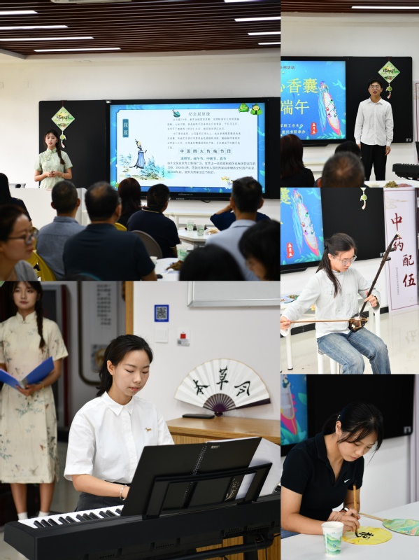 活动开始,药学院中药学专业的同学向大家介绍了端午节民俗文化,天使书院同学表演了传统文化节目:诗朗诵《浣溪沙端午》、钢琴演奏《梁祝》、二胡独奏《战马奔腾》和团扇书法艺术。中药学专业教师现场演示了香囊制作、药材选用等环节,详细向大家讲解香囊的医用及佩戴价值。