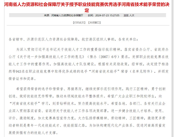 近日,从河南省人力资源和社会保障厅发布的《关于授予职业技能竞赛优秀选手河南省技术能手荣誉的决定》获悉,我院杨辰飞和陈光伟2名教师,被河南省人力资源和社会保障厅授予“河南省技术能手”荣誉称号。