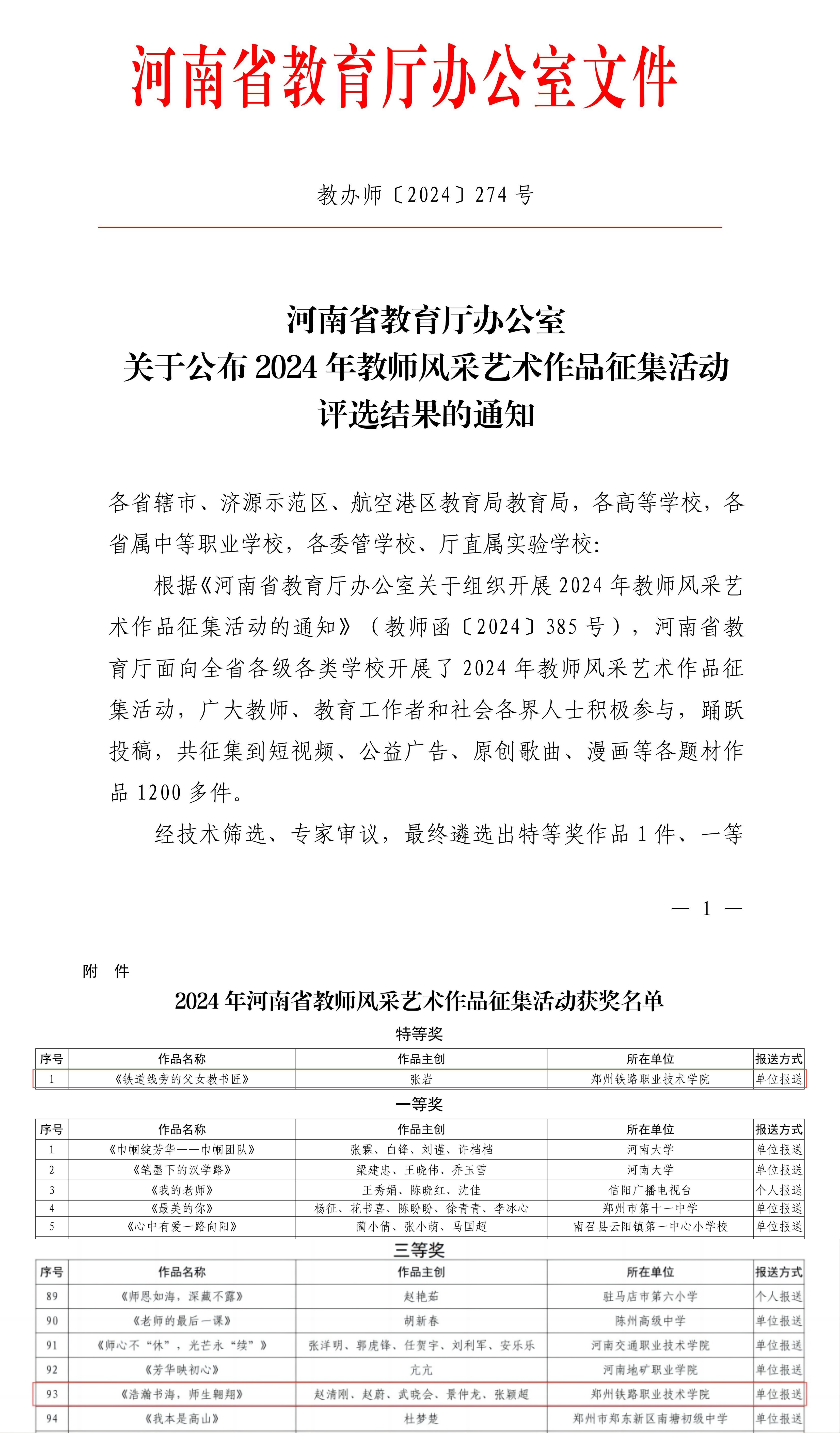 为庆祝第40个教师节,深入贯彻落实习近平总书记关于教育的重要论述,大力弘扬教育家精神,在全社会营造尊师重教的良好氛围,教育部教师工作司联合中国教育电视台、教育部宣传教育中心等,面向全社会开展了2024年教师风采艺术作品征集活动。河南省面向各级各类学校征集各题材作品1200多件,我校张岩指导的作品《铁道线旁的父女教书匠》荣获全省唯一特等奖,赵清刚、赵蔚、武晓会、景仲龙、张颖超指导的作品《浩瀚书海,师生翱翔》荣获三等奖。