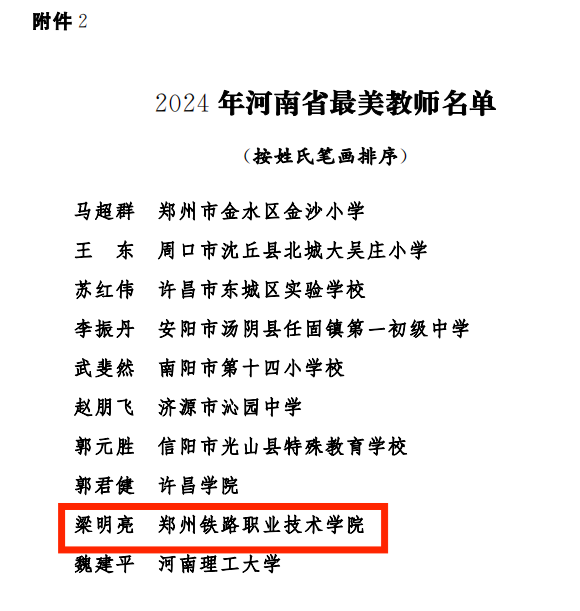 根据《中共河南省委宣传部中共河南省委教育工作委员会河南省教育厅关于公布2024年河南省教书育人楷模、2024年河南省最美教师名单的通知》(豫教师〔2024〕229号),我校梁明亮教授被授予2024年“河南省最美教师”称号,为我校教师首获此项荣誉。