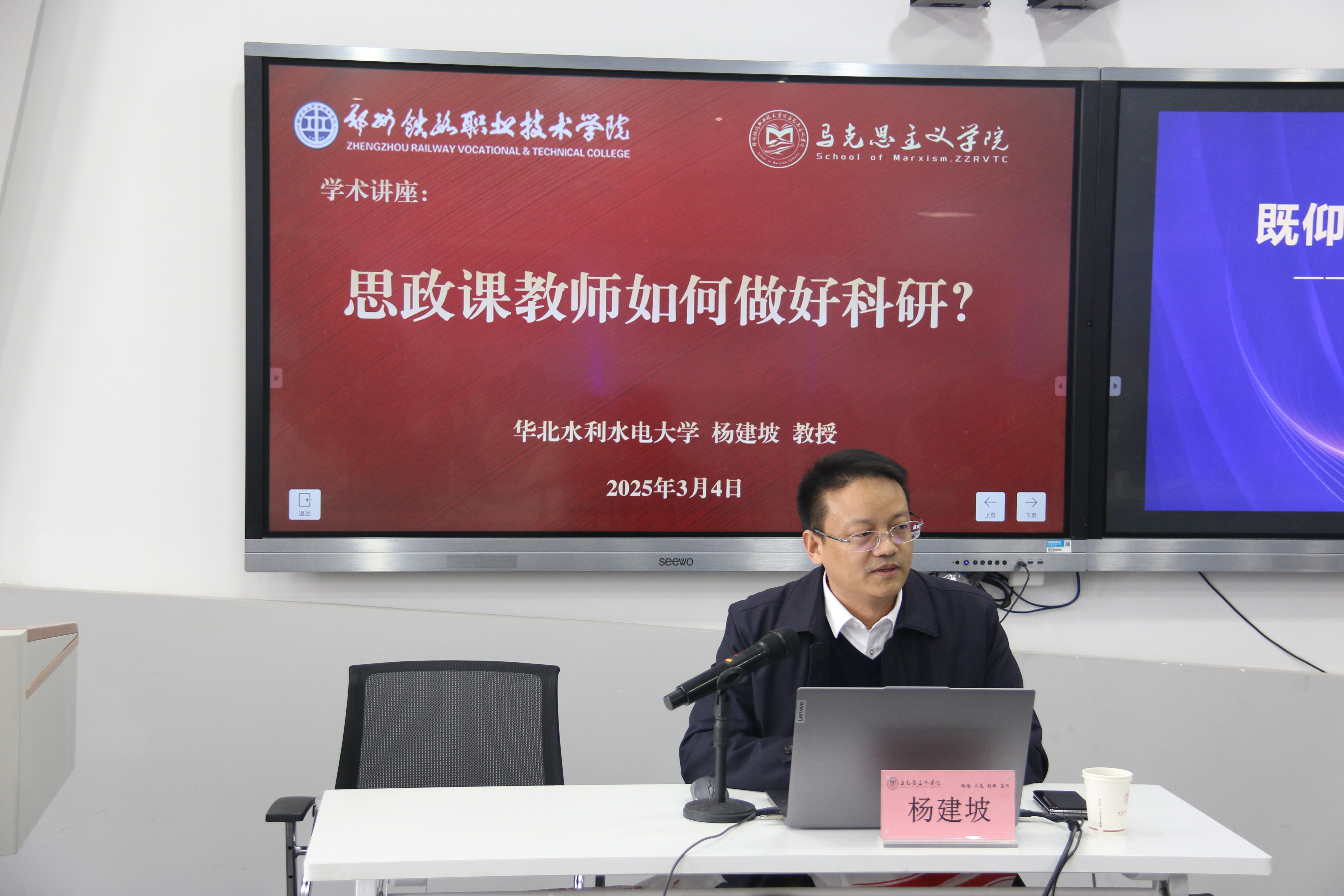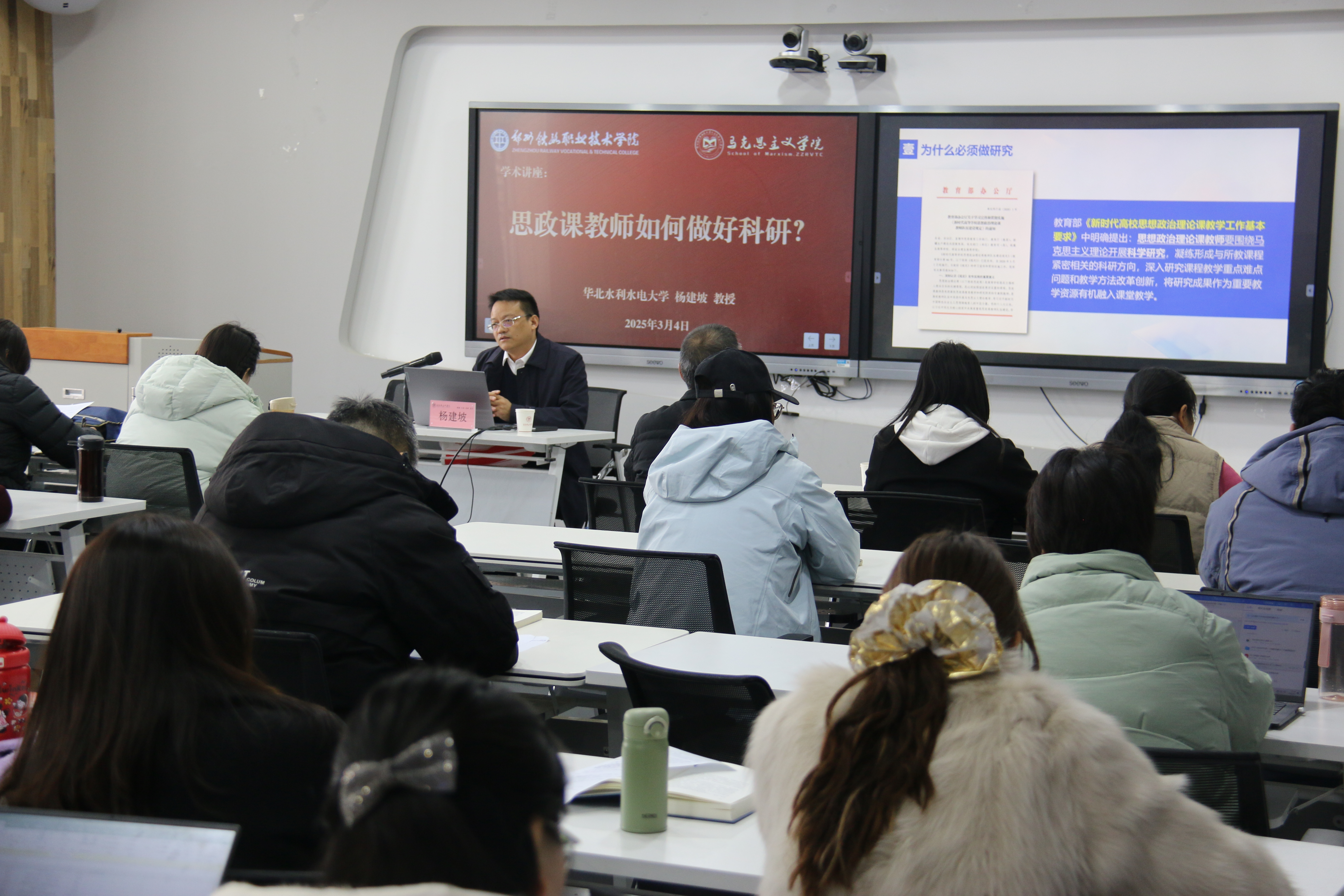 3月4日下午,我校马克思主义学院特邀华北水利水电大学马克思主义学院党委书记杨建坡教授,以《既仰望星空又脚踏实地——思政课教师如何做好科研》为题开展了专题讲座。围绕“思政课教师为什么必须做科研”“如何确定研究方向”“怎样开展研究工作”“科研基本素养养成”四大维度展开系统讲解,马克思主义学院50余名思政理论课专兼职教师参与了学习研讨。