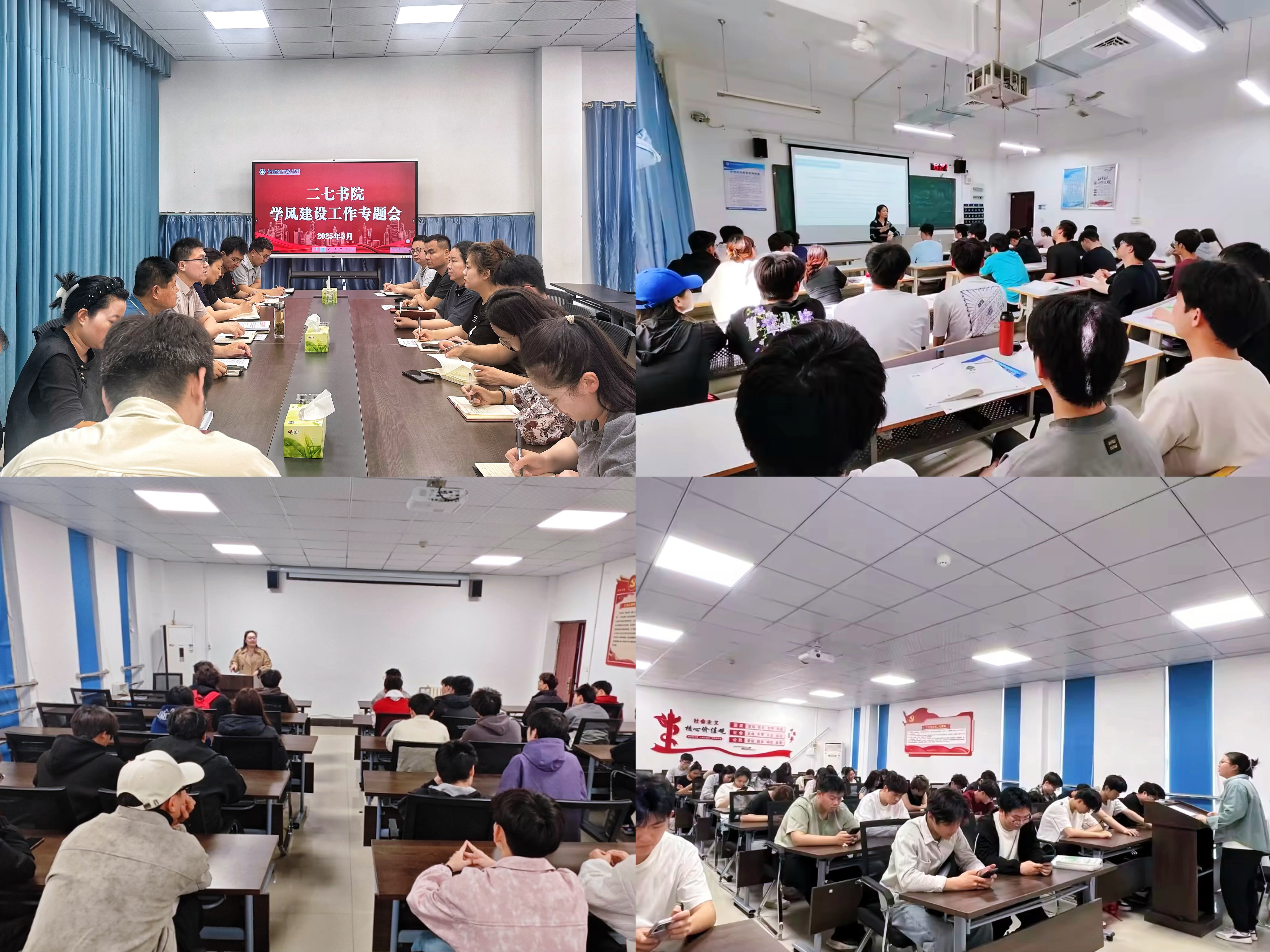 书院召开学风建设专题会议,制定了《二七书院关于常态化加强学风建设的通知》,明确工作目标、责任分工以及有关检查、活动安排。随后,全体专兼职育人导师组织开展学风建设主题班会,教育引导学生端正学习态度,专注课堂学习,提升学习素养。