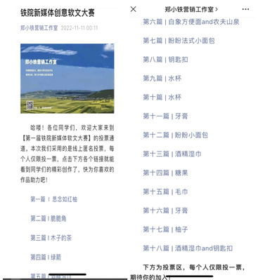 目前,已进入投票环节,18篇创意文案已上传至“郑小铁营销工作室”公众号。同时,还会通过留言评论的形式,向全校学生征集上传到“郑铁优选”平台的商品,也会向参与评论的同学送出水果大礼包及盲盒等奖品。
