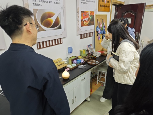 在冯松浩老师的引导下,商学院教师团队深入了解非遗线香的品类体系与药理功效,并逐一参观了工作室自主研发的纯中药手工制品,涵盖挂件、香包、中草药皂、香薰、足浴包、香水等多款香文化衍生产品。所有作品均秉承传统技艺,坚持纯手工制作,体现了非遗技艺与现代生活美学的深度融合。