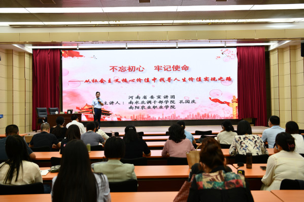 9月15日,南阳农业职业学院院长、博士生导师孔国庆教授应邀来校作“师德师风建设暨教师的能力作风建设”专题讲座。党委副书记、工会主席徐宏平出席并主持讲座,马克思主义学院专兼职教师及各教学院部教师代表通过线上线下相结合方式聆听讲座。