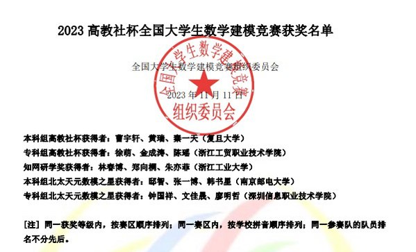近日,2023年“高教社杯”全国大学生数学建模竞赛成绩公布。我校32支代表队均获大奖,喜获历年来最佳成绩,实现历史性突破。其中,喜夺国家级一等奖3个、二等奖4个,省级一等奖8个、二等奖17个。国家级奖项数量位居全省高校专科组第一名、全国第二名。