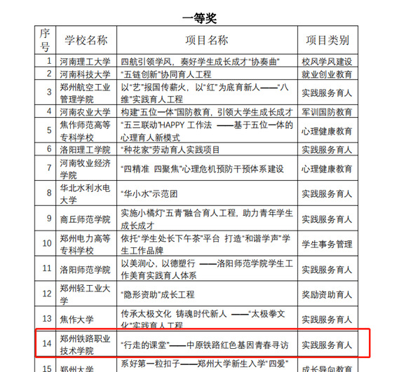 近日,河南省教育厅下发了《关于2022年普通高等学校学生工作优秀成果项目获奖名单的公示》,根据《河南省教育厅办公室关于组织开展2022年普通高等学校学生工作优秀成果项目评选的通知》要求,经高校推荐、省教育厅组织专家评审,通过网络评审、专家评议、现场展示、专家终审等环节,评选出2022年普通高等学校学生工作优秀成果项目一等奖20名、二等奖30名、三等奖40名。我校实践服务育人《“行走的课堂”——中原铁路红色基因青春寻访》项目荣获一等奖,成长导向教育《“红色音符”唱响“新时代华章”,天使书院构建“音乐+”育人新模式》项目荣获三等奖。