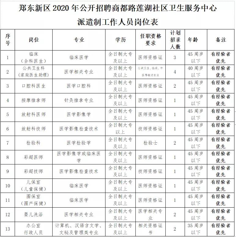 本次公开招聘涉及13个岗位,共招聘22人,具体岗位见(附件1)《郑东新区2020年公开招聘商都路莲湖社区卫生服务中心派遣制工作人员岗位表》。
