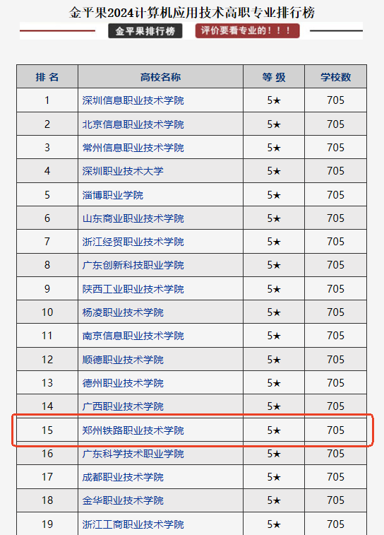2024年5月,金平果中评榜(GAR)第五次发布全国高职院校专业竞争力排行榜,我院计算机应用技术专业在全国705个开设该专业的高职高专院校中排名第15,在河南省内排名第一,稳居“5★”等级。