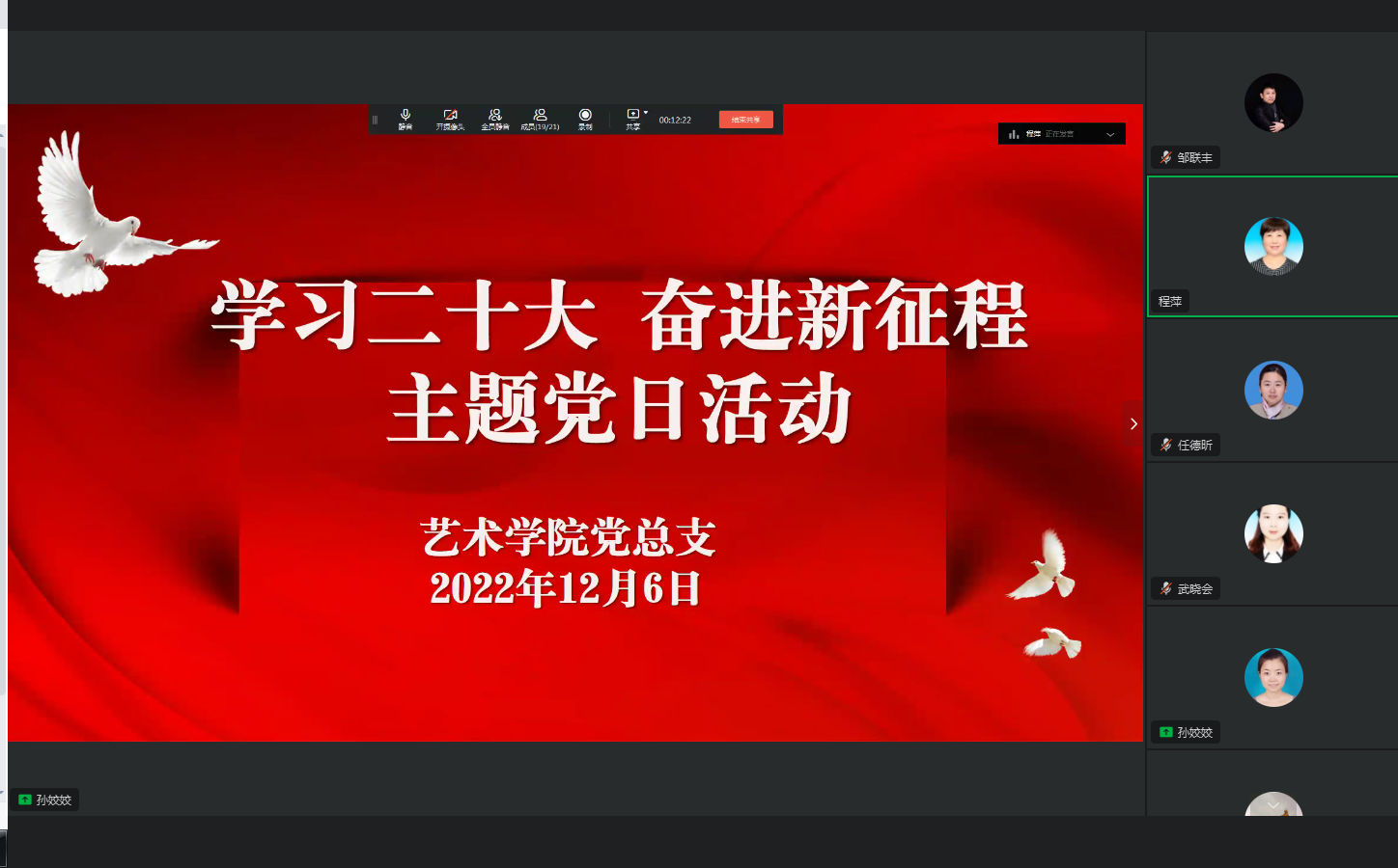 12月6日,艺术学院党总支利用钉钉视频会议开展“学习二十大 奋进新征程”主题党日活动,全体党员线上参会。