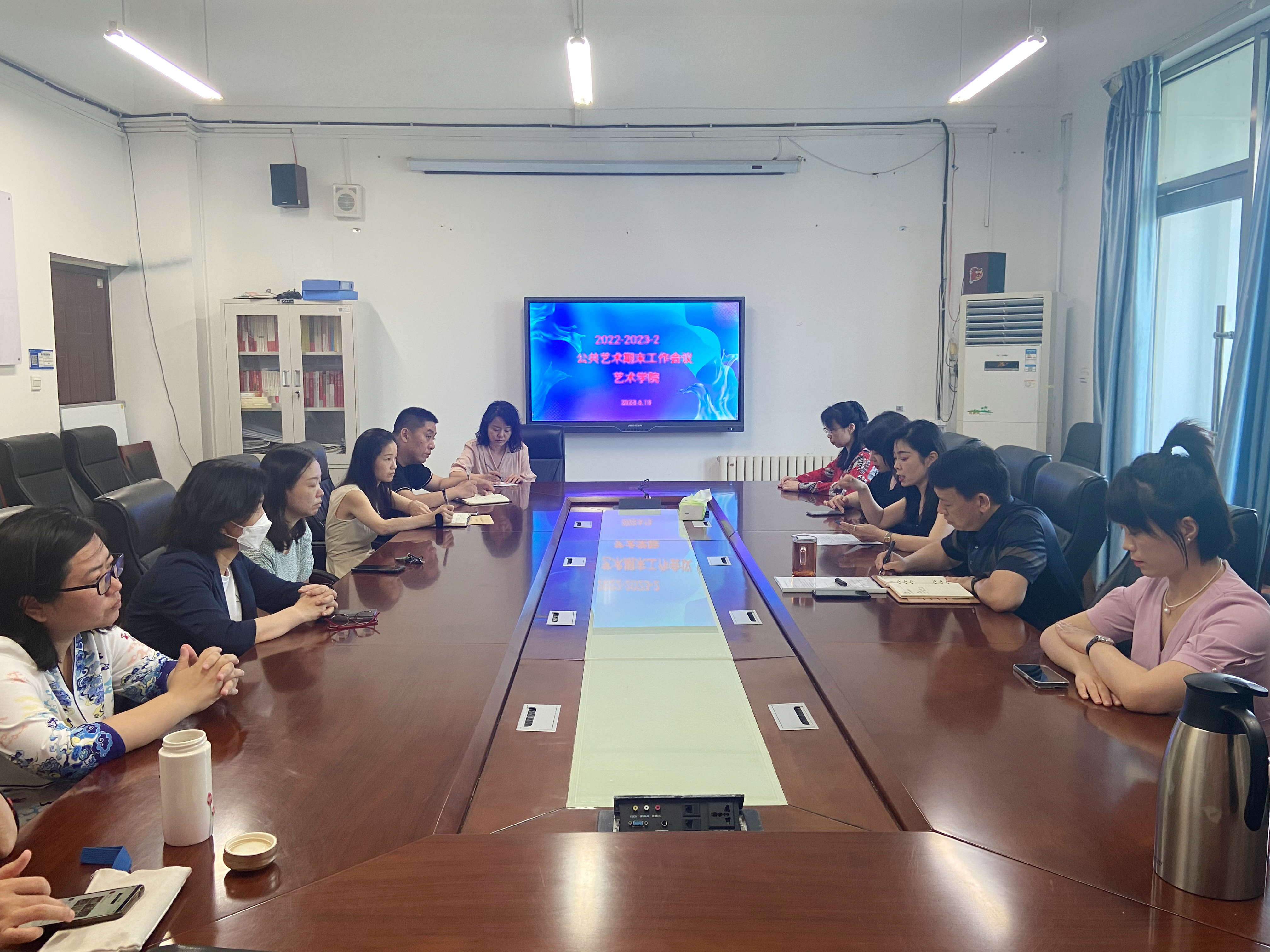 2023年6月13日下午,艺术学院2022-2023第二学期公共艺术期末工作会议在一号楼会议室1316召开,本次会议由艺术学院院长邹联丰主持,公共艺术教研室主任李盈总结发言,公共艺术教研室全体教师及全校担任公共艺术课程的教师参会。