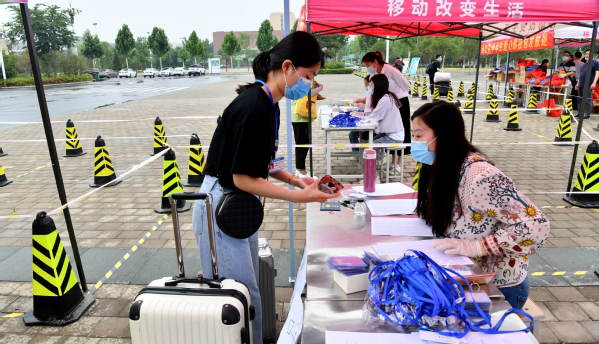 On the basis of the careful organization and repeated practice of the party committee of the school, by following the principle of “peaking shifting and returning by batch”, 563 students in the nursing, nursing (concentration in ICU) and midwifery majors of Grade 2018 came back to the school on June 9. Xu Yan, the secretary of the party committee, Kong Fanshi, the deputy secretary of the party committee and the president, Xie Qian, the deputy secretary of the party committee and the secretary of discipline inspection commission, and Dong Lisheng, Xu Hongping, Wang Baojun and Ni Ju, the vice presidents guided the returning of the students, warmly welcomed the students to “go home” and genially talked with the students having returned to the school on site.