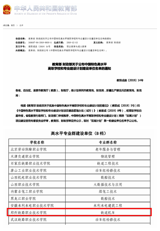 On December 13, the Ministry of Education and the Ministry of Finance issued the Notice of the Ministry of Education and the Ministry of Finance on the Publication of the Unit List of the Construction Plan of High-level Vocational Colleges & Specialties with Chinese Characteristics, indicating the list of the first round of construction units in the “Construction Plan of High-level Vocational Colleges & Specialties with Chinese Characteristics”. And, our college was successfully rated as the “High-level Major Group Construction Unit”. By taking the opportunity, the school will actively serve the national strategy of “country with strong transportation network” and “the Belt and Road” initiative, actively cater for the demand of the China high-speed railway on “safe, convenient, high-efficient and green” technical development and of the central region on the construction of the international and modern integrated transportation hub, greatly promote the school-running system and education system to implement the reformation and innovation, and establish a high-level vocational college leading the reform of the Chinese vocational education, supporting the China high-speed railway to develop continuously in a leading manner and showing the Chinese characteristics and world influence.