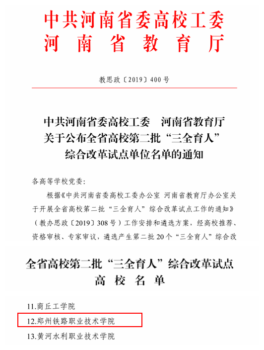 On June 6, the University Working Committee Office of the Provincial Party Committee of Henan and the Education Department of Henan printed and distributed the Notice on the Publication of the List of the Second Batch of Experimental Colleges of the Comprehensive Reform of “Three-wide Education” in Henan (JSZ (2019) No. 400), indicating the school was successfully approved as one of the experimental colleges of the comprehensive reform of “Three-wide Education” in Henan. The school will continuously promote the implementation of the ideological and political work quality improvement work, strive to construct a set of work mode for the “Three-wide Education”, form a batch of characteristic brands of “Three-wide Education”, achieve many fruitful results for the “Three-wide Education” and try to cultivate the socialism builders and successors comprehensively with all-around development of moral, intellectual, physical, aesthetics and labor education. The case of “New Media “3+3+3 and Voice Spreading of Zhengzhou Railway Vocational & Technical College” was rated as Top 50 innovation demonstration case of network ideological and political work of vocational colleges and universities in 2019. The WeChat Official Account was rated as “Top Ten WeChat Official Accounts of the Nation-wide Vocational Colleges and Universities in 2018-2019”.
