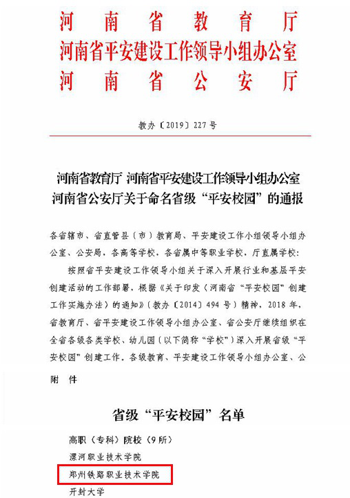 On May 9, the Education Department of Henan, the Peace-building Leading Group Office of Henan Province, and the Department of Public Security of Henan jointly issued the Notice of the Conferring of the Title of “Peaceful Campus” (JB (2019) No. 227), and our college was awarded the title of “Peaceful Campus” and further perfected the security working mechanism, perfected the security system, strengthened the implementation of the security liabilities, ensured the result of the peaceful campus construction, continuously promoted the stability maintenance and security to a new level and made more contributions to the construction of “Peaceful Henan”.